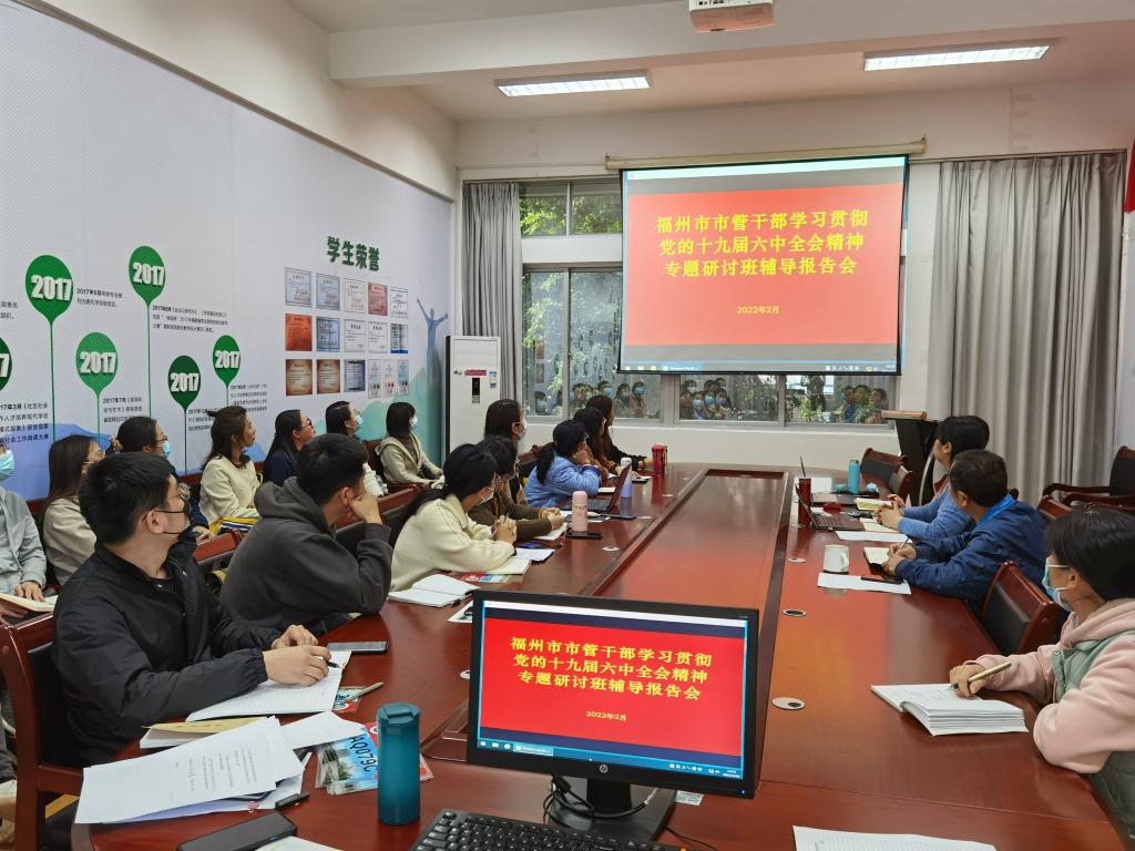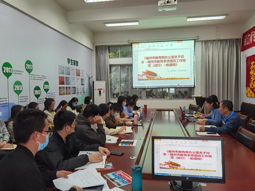 会上,陈勤副院长带领大家学习了全国两会精神,刘少艾副院长带领大家学习习近平总书记出席全国两会有关会议时的重要讲话精神文件精神和《福州市教育局办公室关于印发<福州市教育系统值班工作规范(试行)>的通知》文件。最后,大家一起观看了《学习贯彻党的十九届六中全会精神专题研讨班第三场专题辅导报告会视频录像》。