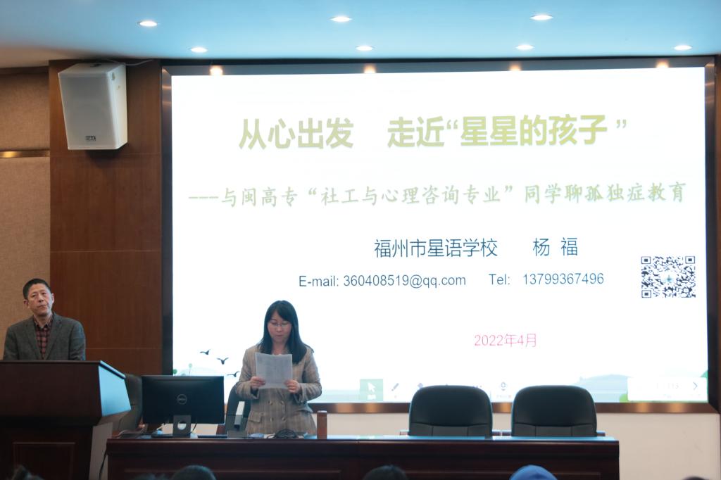 为最大限度地发挥师资优势,更好地将异常心理知识和心理辅导技能融合在一起,提升心理咨询专业学生的儿童心理服务技能,4月20日晚,人文与管理学院心理教研室特邀教育部基础教育教学(特殊教育)指导专业委员会委员、福州市第一节“闽都英才”基础教育名师人才、福州市星语学校杨福校长在大赢家体育app下载仓山校区报告厅开展了“从心出发,走进‘星星的孩子’”专题讲座,教研室主任谢姗姗老师、《变态心理学》教师白丽、相关专业学生参与了此次活动。