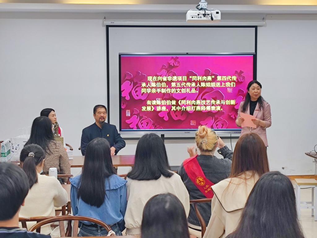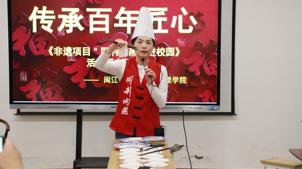 活动中,主持人邱登辉教授首先为本次活动进行引言,介绍陈君凡先生,并且引领同学进行福州方言快板的表演,展示平时的福州方言教学成果。之后,陈勤副院长发表精彩致辞,为陈先生送上我院的文创产品,表达出对于陈君凡先生的欢迎,希望陈先生能为本次职教周增添浓厚的色彩,体现出闽师人文精神和对“能工巧匠”的重视程度。随后,陈君凡先生进行《同利肉燕技艺传承与创新发展》的宣讲,深入交流闽都文化与福州本地情况,很大程度上帮助我院同学了解福州的地区概况。宣讲结束后,打燕师傅开始精彩的打燕表演。陈燕君女士现场教导同学们包肉燕,带领同学们走进非遗,感受非遗。最后,由在场的师生一同分享煮好的肉燕,合影留恋,同时也使工匠精神更加深入人心。