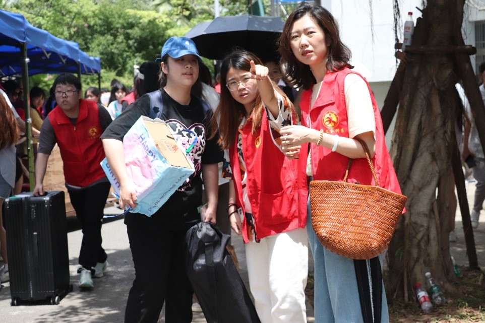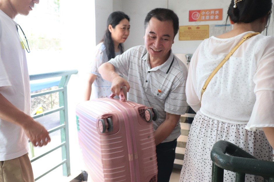 在搬迁工作现场,学院领导现场统筹,并协助搬运。在学院领导的组织下各志愿者分队分工明确、秩序井然。“点对点”的行李搬运工作完毕后,教师志愿者们走访宿舍、慰问学生,听取学生反馈的困难和需求,并帮助学生寻求解决方案。