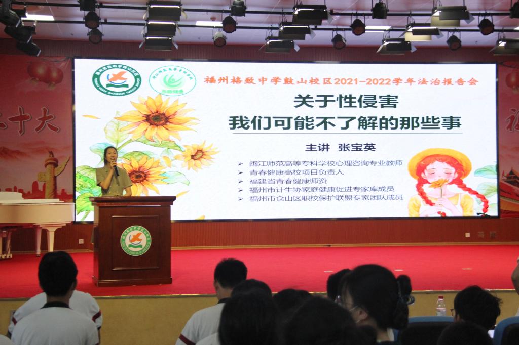 为进一步落实“青春健康”项目工作,丰富格致中学鼓山校区青春健康教育和青少年法治宣传教育,提高青少年的自我保护意识,创建和谐校园、平安校园,为同学们营造健康成长的良好氛围,7月15日上午,福州格致中学鼓山校区举行福州市计生协赠书仪式、2021-2022学年高中闭学式暨法治报告会。市计生协党组成员、副会长鲁大治,市计生协组织宣传处处长、四级调研员刘武,市计生协组织工作人员李桓,大赢家体育app下载心理专业教师、福建省青春健康师资、福州市仓山区职校保护联盟专家团队成员张宝英受邀参加,福州格致中学鼓山校区书记、校长蒋铭生,副校长钱玮韡,校青春健康俱乐部负责人刘莹颖、李丽玉等出席,校德育处成员及高一、高二年段全体师生参加本次活动。