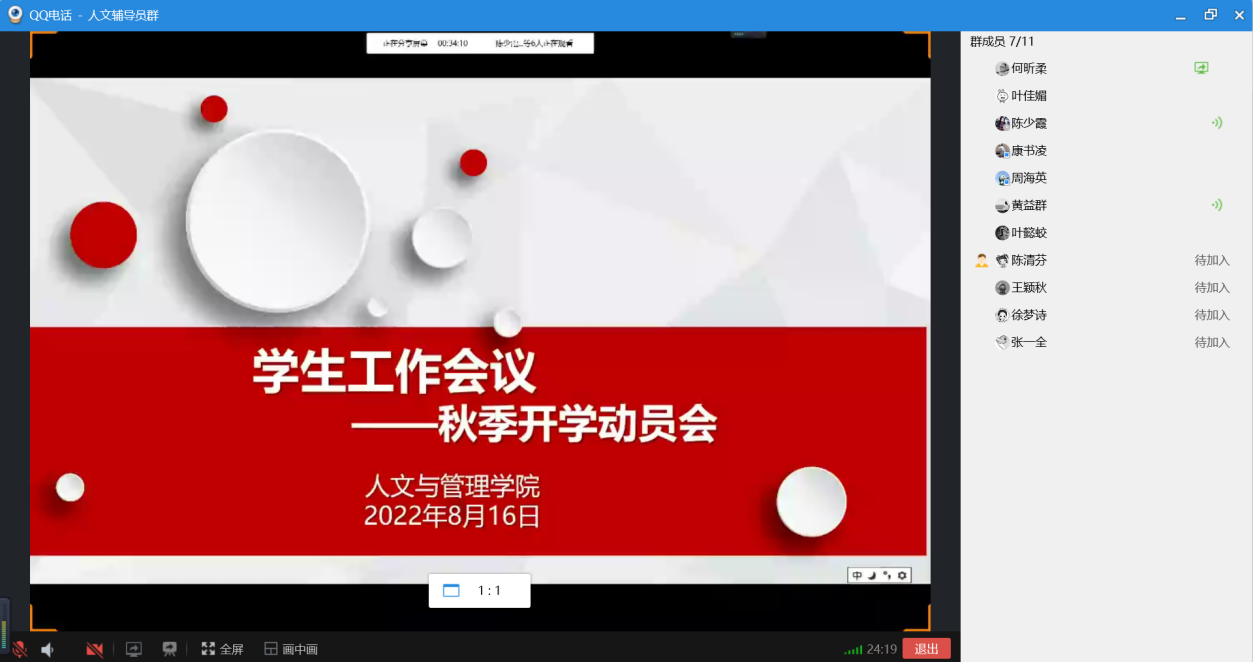 为做好学院2022年秋季新学期的各项工作。2022年8月16日,人文与管理学院开展秋季开学学工工作动员会,本次会议以线上会议形式进行,人文与管理学院团委书记黄益群、学院全体辅导员参与了本次会议。