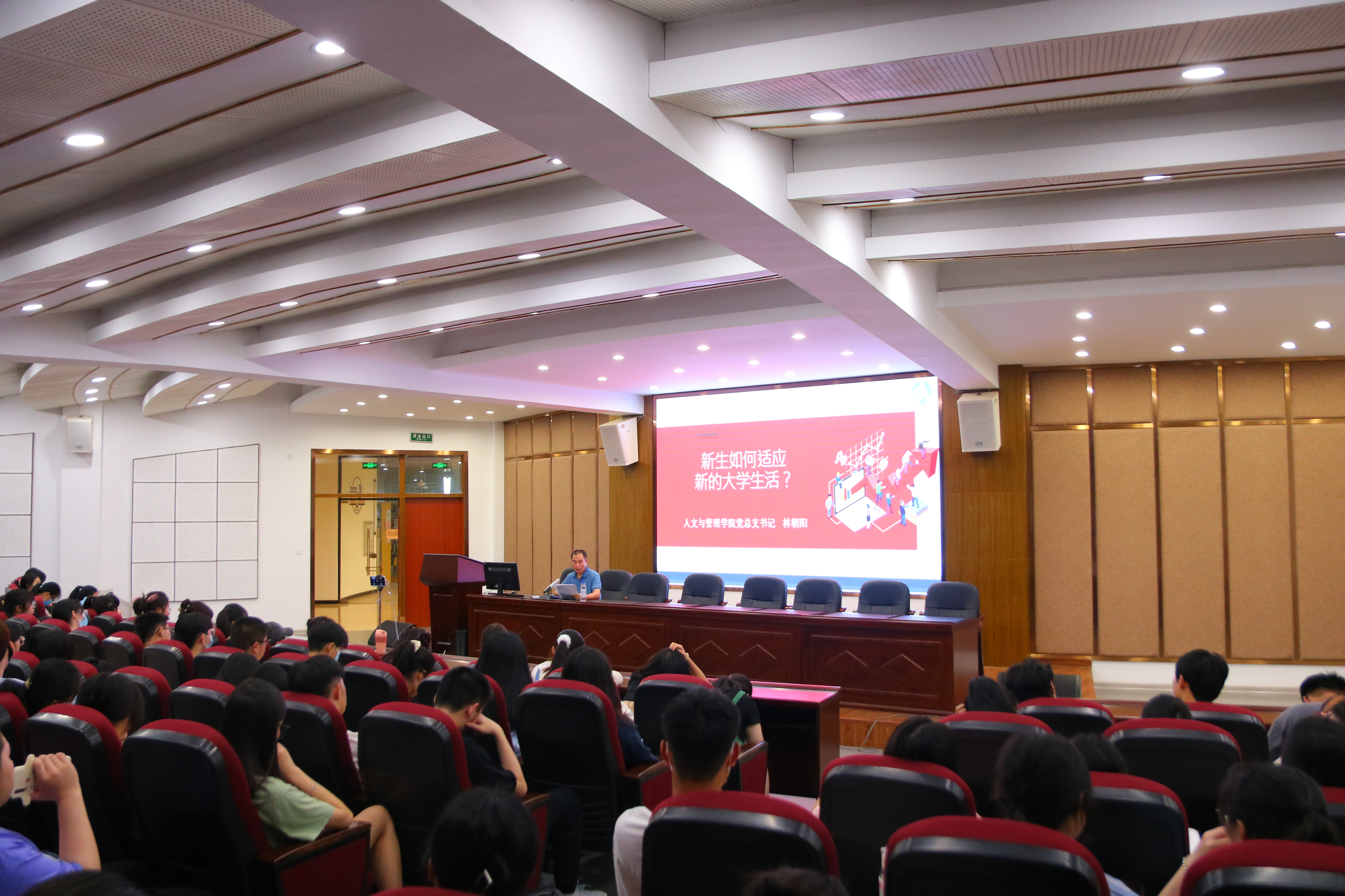 会上,林朝阳书记首先代表学院向全体人文新生表示热烈的欢迎和衷心的祝福。随后,他以交流的方式向新生们提出三个问题:什么是大学、如何过好大学生活及如何正确看待学校疫情防控工作。林朝阳书记谈及大学之大,结合我院校区分布情况回答,强调大学之大不止大于学校所占面积,更是在于大德,大学生们作为当代青少年应凝练品格,树立责任担当,明确人生理想,做担当民族复兴大任的时代新人;大学是产生学问和思想的地方,在大学里新生们不仅学习课本上的知识,更多的是教师的传道、授业解惑。叮嘱学生从学会选择、学会宽容两个方面指引新生们在生活、学习中稳当前行。