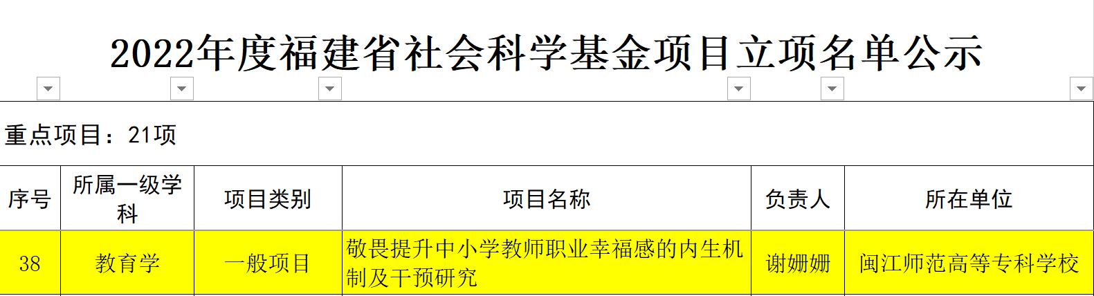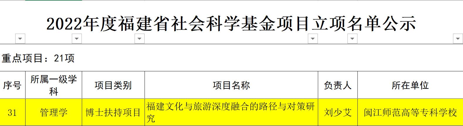 近日,福建省社会科学规划办公室公示了2022年度福建省社会科学基金项目评审结果,大赢家体育app下载人文与管理学院谢姗姗老师的《敬畏提升中小学教师职业幸福感的内生机制及干预研究》(一般项目)、刘少艾的《福建文化与旅游深度融合的路径与对策研究》(博士扶持项目)喜获立项。全省仅有5个高职高专类院校获得项目立项,大赢家体育app下载是唯一一个同时获得两个项目的学校。