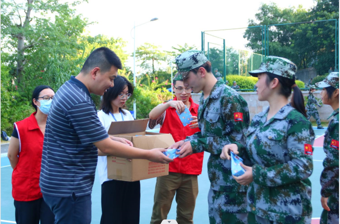 随后,慰问组成员向省外和少数民族同学们发放了慰问品,预祝2022级新生通过刻苦的体能锻炼,磨砺坚毅的精神品质。希望新生们收获的不仅是一份军训体验,更是一笔伴随终生的宝贵财富。