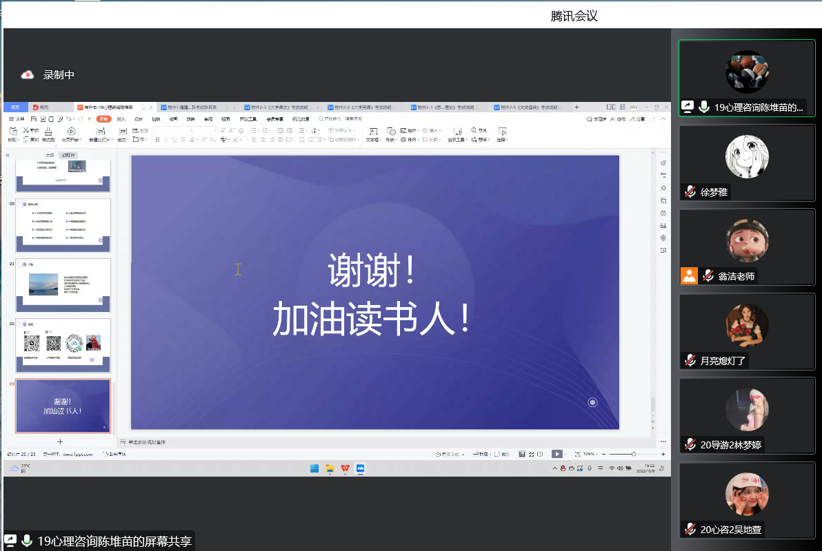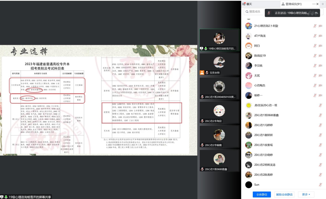 2022年11月9日,人文与管理学院心理教研室开展的“教育类和管理类专升本指导会”在腾讯会议举行,全体学院准备专升本考试的同学参加,本次专题培训邀请了19级优秀毕业生陈堆苗和杨雪芹主讲,由心理教研室翁洁老师、张宝英老师主持。