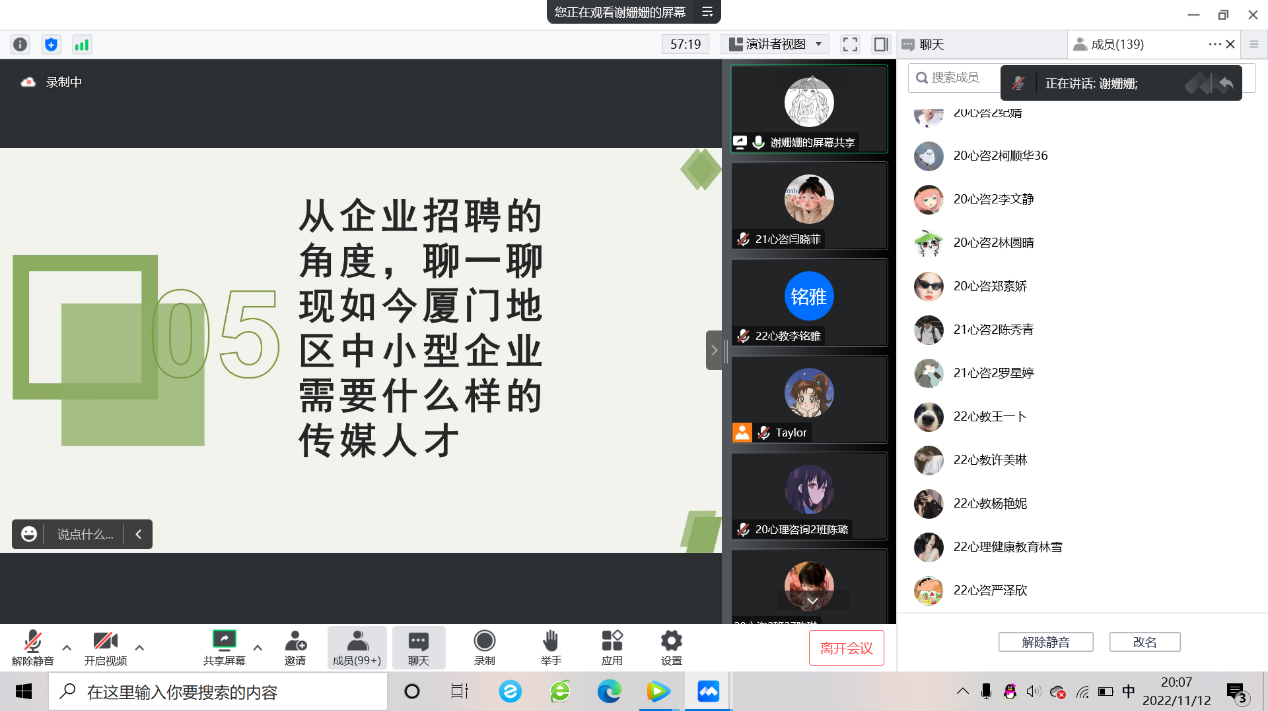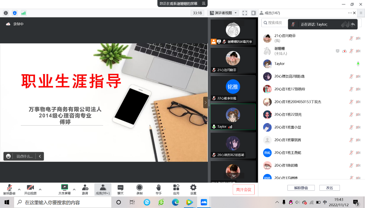 为了引导学生做好职业生涯规划、提升职业素养和就业竞争力。11月12日,人文与管理学院在腾讯会议开展了职业生涯指导专题讲座,本次活动特邀14级心理咨询专业、万事屋电子商务有限公司法人傅婷主讲,教研室主任谢姗姗主持,全体心理专业学生参加。