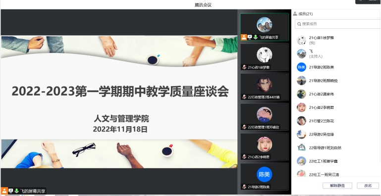 为进一步加强教学管理,提高教学质量,人文与管理学院于11月18日召开线上2022-2023学年第一学期期中教学质量座谈会。我院副院长(主持工作)陈勤,副院长刘少艾,各专业负责人及学生代表等参加了本次会议。