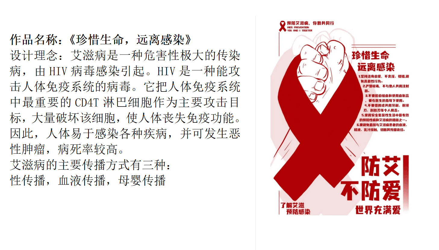 线上活动,通过青春健康、防艾抗艾主题宣传画作品征集活动,学生们对自己对艾滋病的想法和防艾中的方法,结合艾滋病主题元素以图文并茂的形式设计出一张张生动的知识海报。通过作品的名称和设计理念,着力呈现通俗易懂的作品特点,有效提升大学生的防艾意识,预防措施,倡导平等的思想观念。