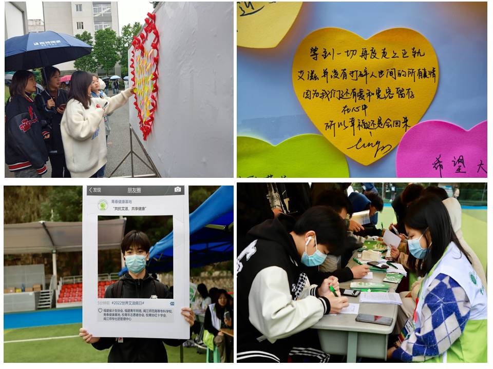 线下活动中,青春健康同伴社联合校红十字会,在旗山校区和仓山校区同步开展了以“共抗艾滋,共享健康”为主题游园活动。活动分为“艾”的理念、“艾”的行动、“艾”的合影、“艾”的来信、笔下的“艾”、“艾”拼才会赢、“艾”的感悟环节等七个环节,学生通过填写防艾宣传问卷和参与问答,了解更多关于艾滋的基本知识。在防艾主题游戏中,团队合作共同参与击倒艾滋,在“艾”拼才会赢、“艾”的感悟中,传递对艾滋病人的关爱,同时写下此次参加防艾游园会的感悟。