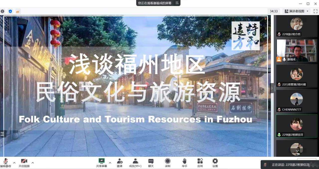 2022年12月7日下午,人文与管理学院导游专业于线上成功举办了“浅谈福州地区民俗文化与旅游资源”讲座。本次讲座邀请了福清市海口中学校长、福清市教育局督学谢福成老师。22级导游专业、行政管理专业、社会工作专业同学共同参与了本次活动。