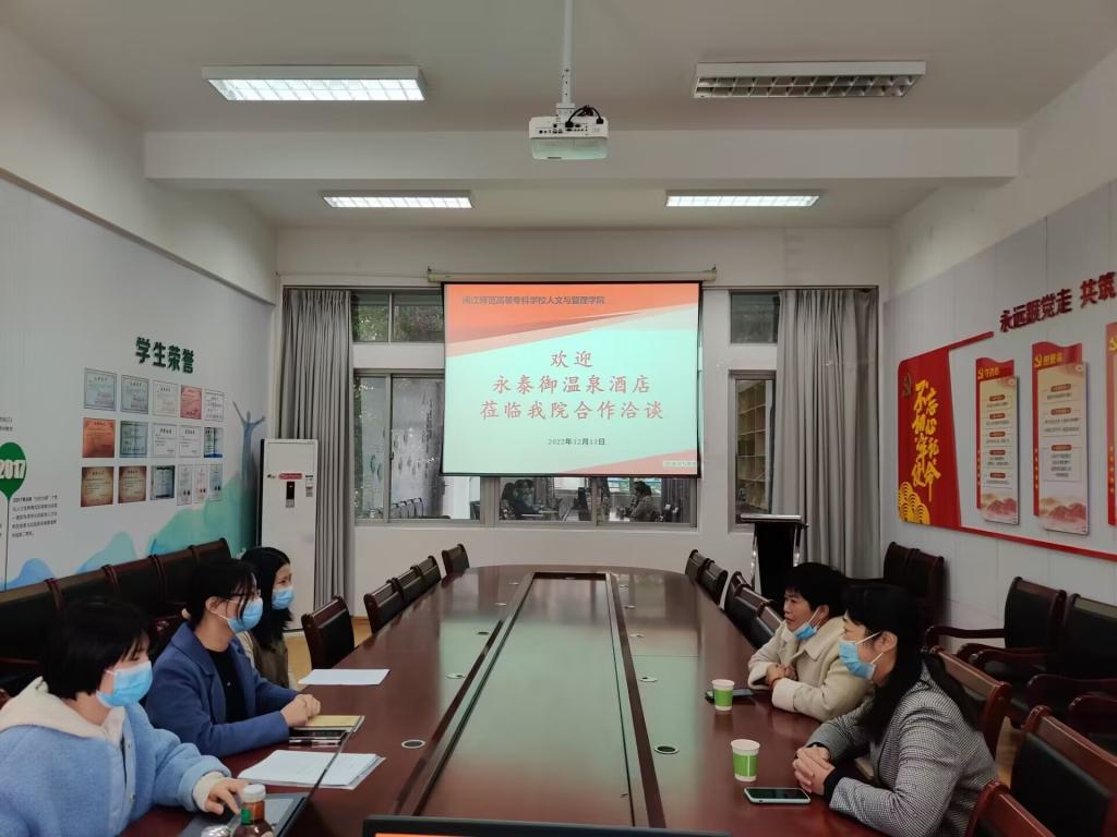 为进一步推进校企合作进程,切实提高导游专业人才培养质量,2022年12月13日下午,福州永泰御温泉酒店总经理候巧玲来我院洽谈校企合作事宜。学院副院长(主持工作)陈勤、副院长刘少艾、导游教研室主任谢颖及专业教师梁虹参加会议。