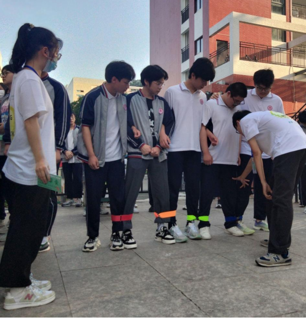 在“五人六足”游戏过程中,同学们互相配合,一起讨论方法,从最初的节奏混乱到最后“一二一”向终点出发的默契,成功让同学们“破冰”。