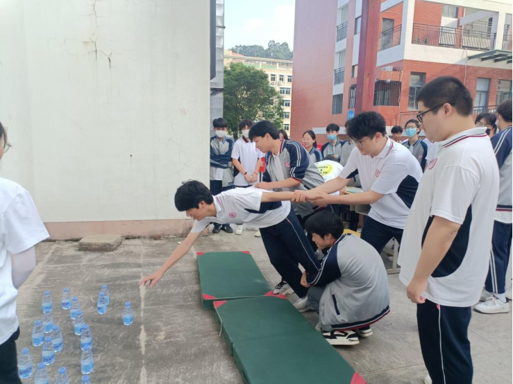 “悬崖取水”游戏考验的是同学们之间的相互信任,每位小组成员都需在同伴的帮助下不碰地面取一瓶水。同学们纷纷挑战,快速建立起了信任,他们互相帮助,一起哈哈大笑,现场氛围也迅速升温。