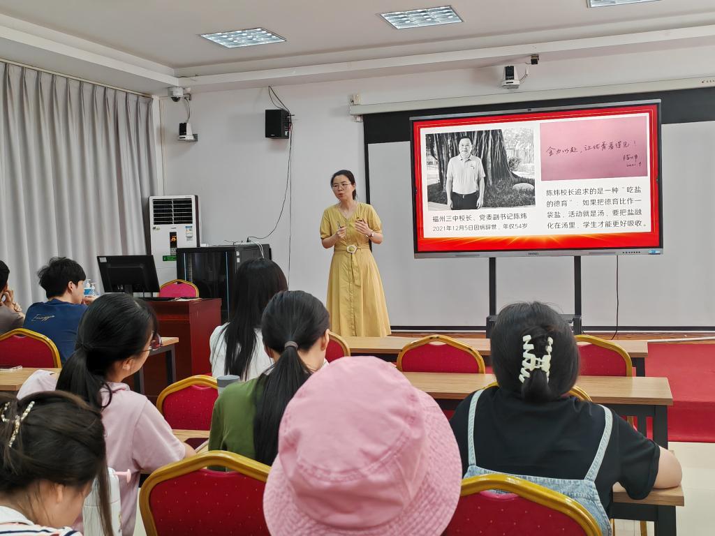 讲座开始余晶老师通过“分享你记忆最深刻的教师”进行互动,同学们踊跃发言,畅谈其成长岁月中与老师的点点滴滴。余晶老师以冰心先生的文章《我的老师》进行分享,同学们表示有爱的教师能够给予学生极大的动力和改变。接下以“四有好老师”为模块,结合福州三中陈炜老师、张桂梅老师等优秀教师的事迹,为同学们阐述了优秀教师们躬耕一线,为国育人的光荣与付出。最后以“四个引路人”为路径,鼓励同学们为成为一名优秀的引路人而奋斗。