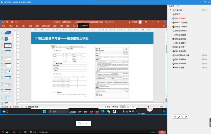 培训会议上,叶佳媚老师从简历的基本内容、简历的正确表述方式以及如何润色简历等几个方面展开,从挑选简历模板的注意事项到如何着重表述个人背景资料等,再到如何在简历中突出个人优势,做出了详尽细致的讲解。提醒同学们要根据求职岗位的需求修改相应的简历内容,不能一份简历多投海投。培训中叶老师根据同学们提交上来的简历在线一对一的提出修改意见,督促同学们培训结束后再次修改简历向指导老师反馈。
