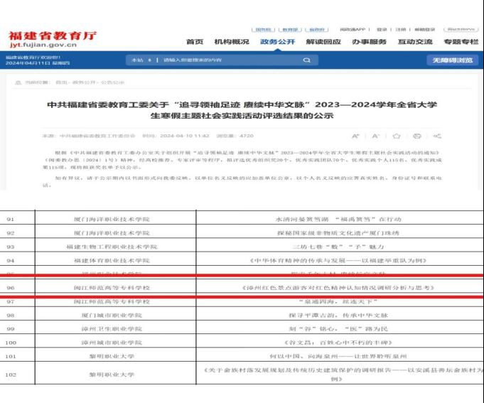 4月10日,中共福建省委教育工作委员会发布《关于“追寻领袖足迹赓续中华文脉”2023—2024学年全省大学生寒假主题社会实践活动评选结果的公示》,我院丁伟鹏、占丽红、章祎骞组成的“人文寻红忆足迹”社会实践队的作品《漳州红色景点游客对红色精神认知情况调研分析与思考》在团委书记黄益群老师的带领下,喜获“优秀实践成果”荣誉称号。
