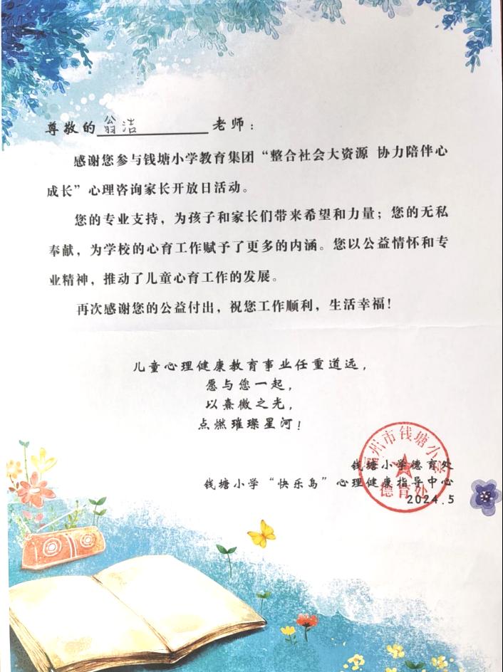 据悉,我院心理教研室每年都派教师参与钱塘小学教育集团的心理咨询家长开放日活动,双方形成了合作默契,共同向小学生家庭提供专业的教育指导。通过向合作的基地校提供心理专业服务,向在地儿童、家庭提供心理健康教育服务、家庭教育指导,我院心理教师团队立足家校社联动,参与共同关注青少年儿童心理健康,既丰富了社会服务的经验,又扩大了专业影响力,体现了我院党员教师的专业风采。