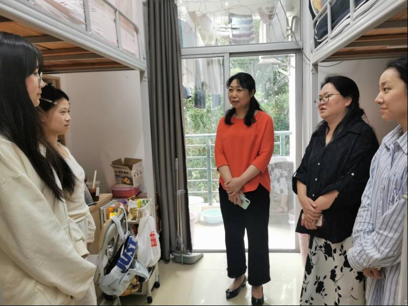 陈勤一行在走访宿舍时,热切关注同学们关于学习、生活的想法与诉求。近期气温上升且流感盛行,老师们提醒同学们要注意空调温度,避免着凉生病,更要注意宿舍用电、用水安全,严格禁止高功率电器,并就同学们关心的各项事务展开充分交流,积极协调指导,为同学们上了一堂别开生面的安全教育与职业生涯规划课,为她们适应大学的实习、升学和就业提出了真诚的建议。