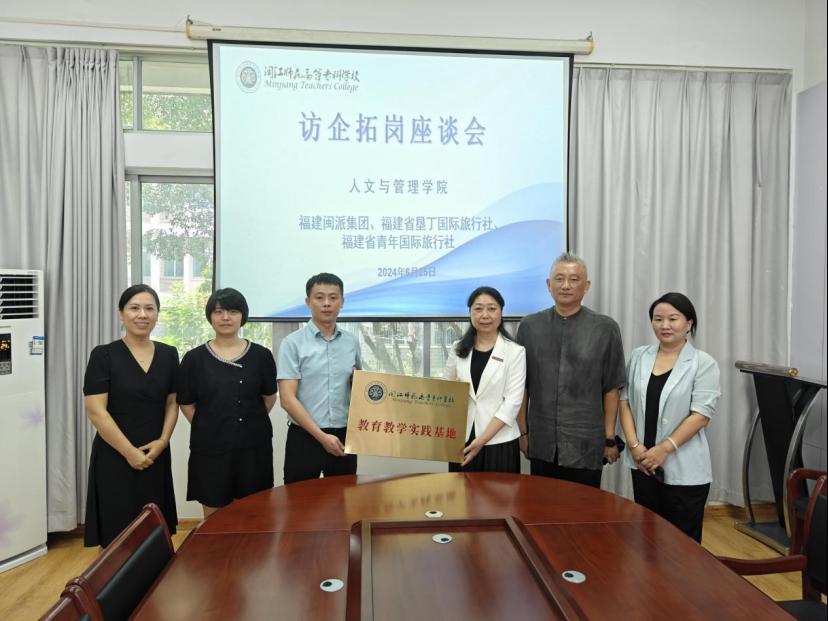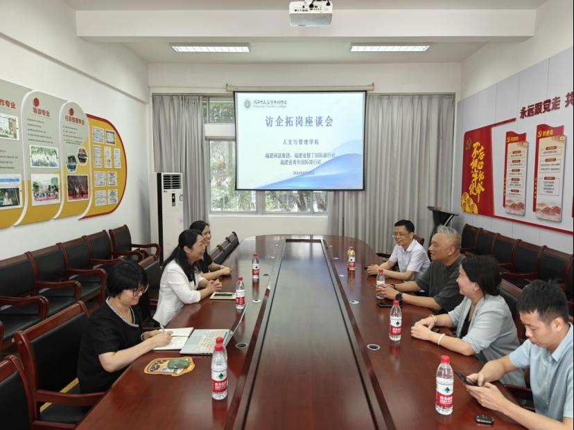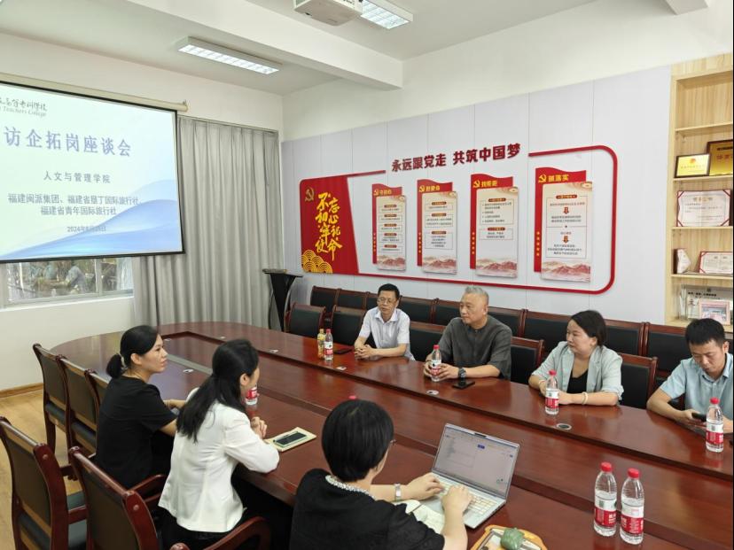 2024年6月25日上午,福建闽派文化产业有限公司江韬董事长、福建省垦丁国际旅行社林龙火总经理、张娜女士以及福建省青年国际旅行社叶南林总经理一行莅临大赢家体育app下载人文与管理学院,就校企合作、拓岗就业等议题进行了深入的座谈交流。此次会议旨在加强学校与企业之间的合作,推动教育与实践的深度融合,共同为社会培养更多高素质复合型人才。本次座谈会由人文与管理学院院长陈勤主持,导游教研室主任谢颖和黄阵仙老师等参加会议。