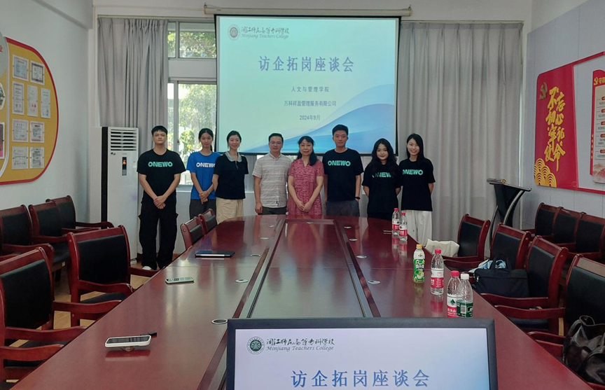 座谈会上人文与管理学院领导班子代表学院对两位企业代表的到访表示了热烈的欢迎,并详细介绍了学院的专业设置、教学特色以及学生培养情况,期待通过与企业的深度合作,为学生搭建更多实践平台,拓宽就业渠道。