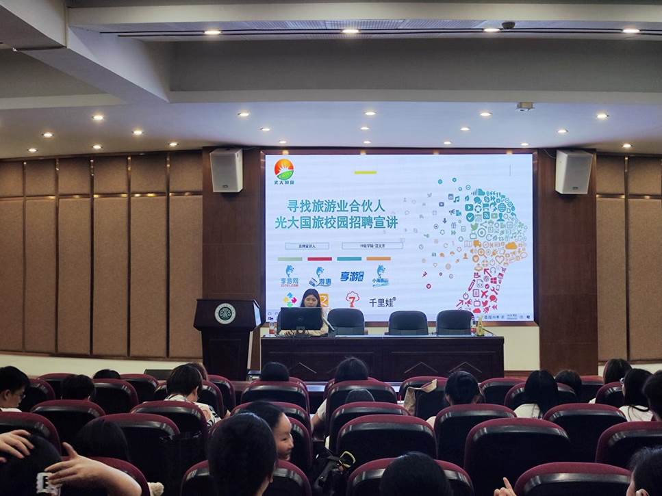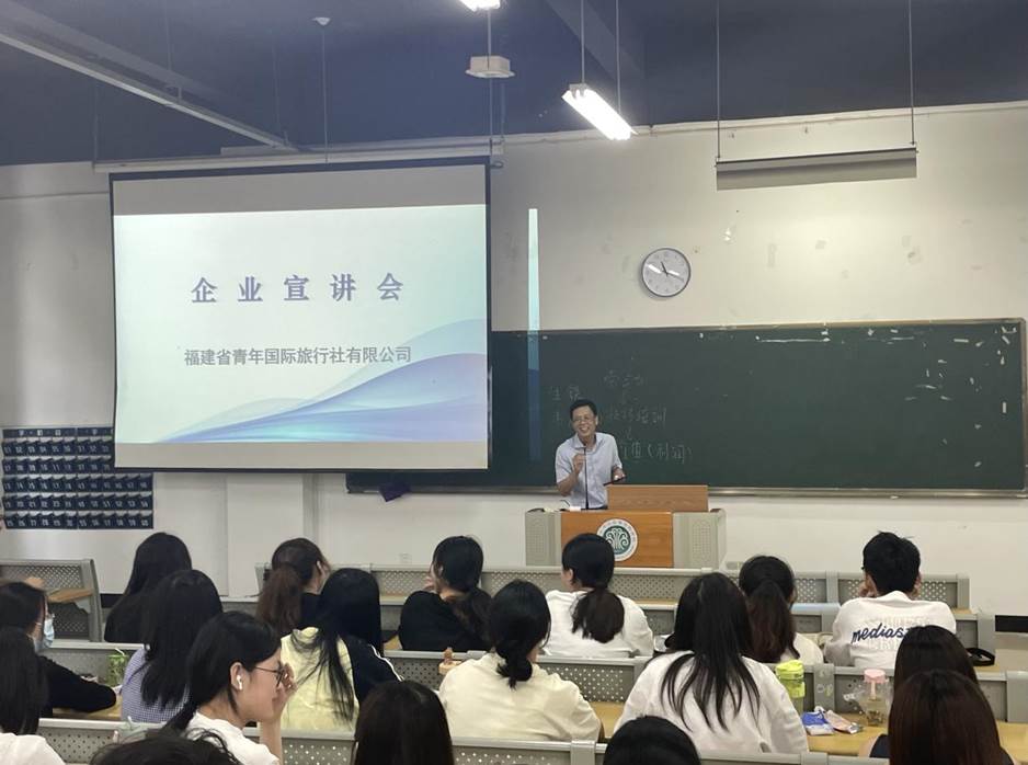 福建省青年国际旅行社有限公司、福建日春股份公司、福州朴朴电子商务有限公司、福州中庚聚龙酒店、福建光大国际旅行社有限公司、万科祥盈管理服务有限公司、众志(福建)数字文化有限公司和福建知行教育科技有限公司的企业负责人陆续进行了精彩宣讲,分别介绍了企业的发展历程、企业文化、岗位需求及职业发展前景等,并与同学们关于岗位职责等就业方面问题进行交流,耐心地解答同学们的困惑,为同学们提供了专业的建议和指导。
