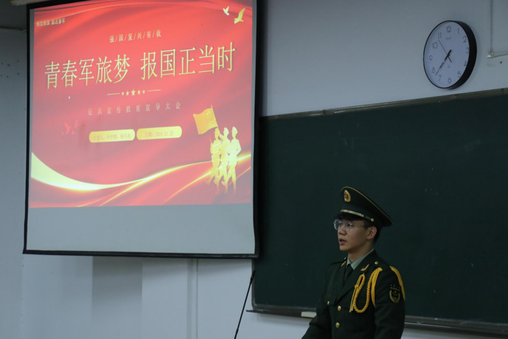 为积极做好2024年征兵工作,切实提高我院适龄青年应征入伍的知晓率和积极性。11月25日,我院于教学楼3-504教室开展“青春军旅梦,报国正当时”征兵宣讲活动,此次活动面向全院全体学生,由我院退伍士兵叶世榕、杨不凡同学主讲。