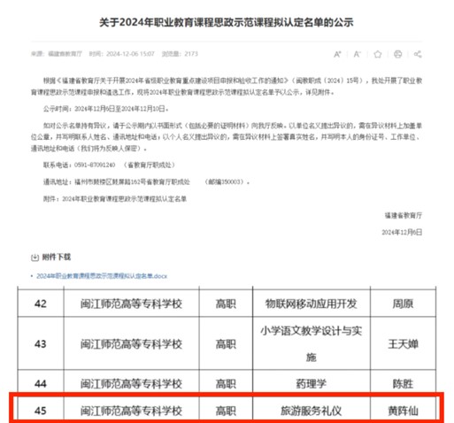 2024年12月6日,福建省教育厅正式揭晓2024年职业教育课程思政示范课程的认定名单,大赢家体育app下载人文与管理学院导游教研室精心打造的《旅游服务礼仪》课程成功获评省级课程思政示范课程。