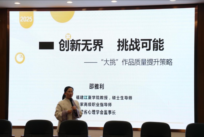为促进学生课外学术科技活动的蓬勃开展,增强学术性与实践性的结合,3月5日,人文与管理学院于仓山校区多功能报告厅开展“创新无限,挑战可能“2025年挑战杯作品质量提升策略讲座活动。本次讲座由福建江夏学院心理教研室主任邵雅利教授主讲,本次活动面向学院全体学生,23、24心理专业学生出席,并同步线上直播。