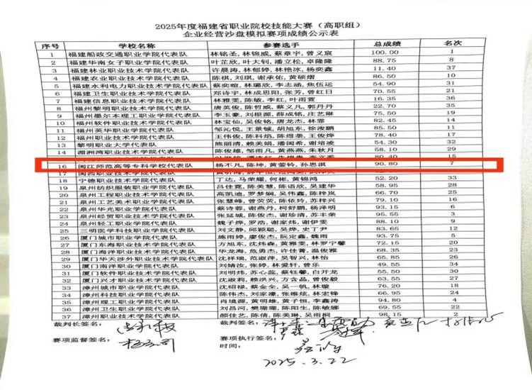2025年3月22日,在2025年度福建省职业院校技能大赛企业经营沙盘模拟赛项中,人文与管理学院行政管理专业袁曦、陈清芬老师指导的学生团队在37支队伍中脱颖而出,斩获二等奖的佳绩。参赛选手杨不凡、陈坤、黄蓥铃、孙思淇凭借扎实的专业知识、出色的团队协作能力与灵活的战略思维,在激烈的模拟经营博弈中展现了卓越风采。