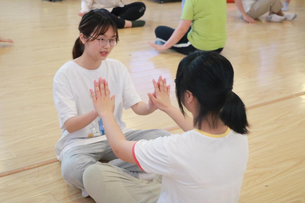 活动伊始,徐老师向同学们普及了舞动治疗的起源与发展和身体创伤的相关知识,让大家对课程相关概念有了初步了解。之后,徐老师通过镜像舞、十指连心舞、花开花合舞、“进攻—防御”模式练习等环节逐步帮助同学们打开身体、投入到课程体验中。为充分挖掘同学们的内在潜能与自我表达,徐老师要求大家跟随音乐律动,每一个人贡献一个在团体中被看见的动作,并进一步引导大家通过无声分组编舞来调动和融入团队力量。期间徐老师还现场演示了如何干预极度缺乏安全感个体的情绪崩溃,丰富了大家的实战经验,提升大家的专业认同。最后工作坊在大家真诚的祝福中拉下帷幕。