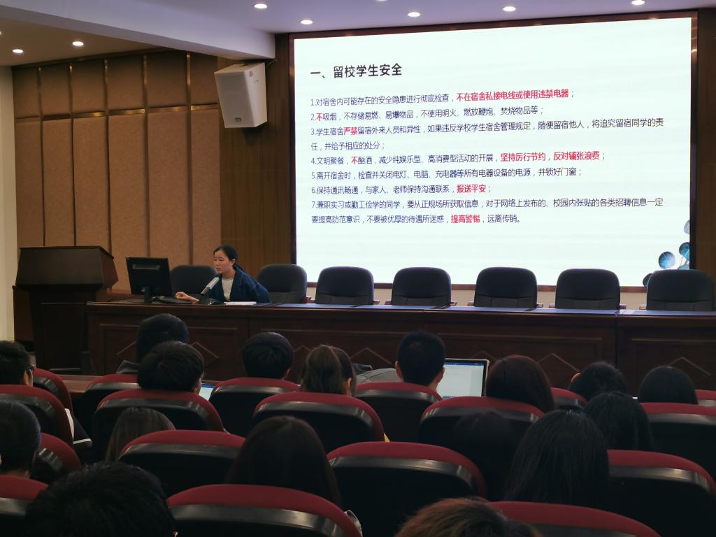 在这次学生安全主题教育中,夏春英辅导员首先针对“大学生应该如何维护国家安全”这一问题与同学们进行讨论和讲解,同时在五一假期来临之际,给大家强调了假期回家过程中的自身生命和财产安全问题,告诉大家要注意车站人潮拥挤,预防偷窃问题,做好自我保护措施。最后,辅导员还特别强调了对于假期留校同学而言,要遵守学校的管理规定,严格遵守校规校纪,按流程申请后再外出,外出期间也要注意外出安全问题。
