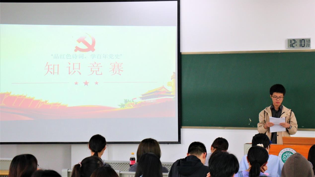 为庆祝我们党百年华诞,回顾党的光辉历程,提升广大学生党性修养与政治觉悟的同时,弘扬红色经典文化,提高人文素养和道德情怀。人文社科系于4月23日采用线上答题的形式进行了初赛,通过成绩排名决胜出前六名选手进入决赛;4月29日在仓山校区3号楼404教室举办以 “学党史践初心,迎百年担使命”为主题的知识竞赛决赛,此次红色诗词竞赛由主持人刘明昊精彩的开场白拉开了帷幕。