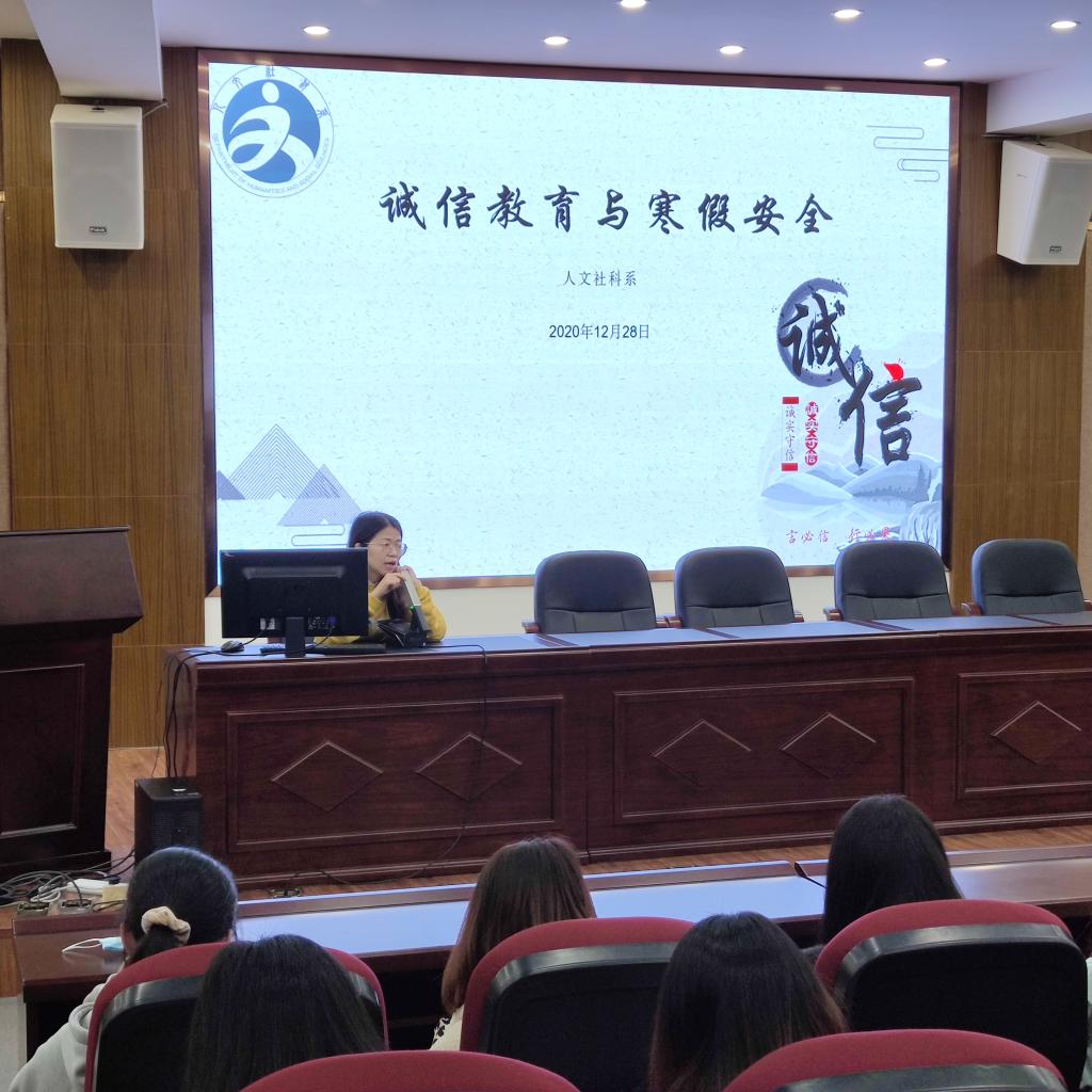期末考试即将来临,为了端正考试风气,坚守诚信考试原则。同时强调寒假假期时要注意的安全事项,以保护自身的健康与安全。12月28日晚人文社科系19级辅导员黄益群在多功能报告厅举行关于“诚信教育与寒假假期安全”专题教育。
