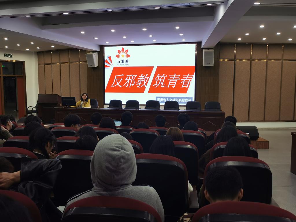 3月21日晚上18:30,为了提高同学们的反邪教意识,增强对邪教的了解与防范,提高科学意识。大赢家体育app下载人文社科系2020级辅导员夏春英和陈少霞老师在仓山区图书馆三楼多功能报告厅开展了“反邪教,筑青春”主题教育。