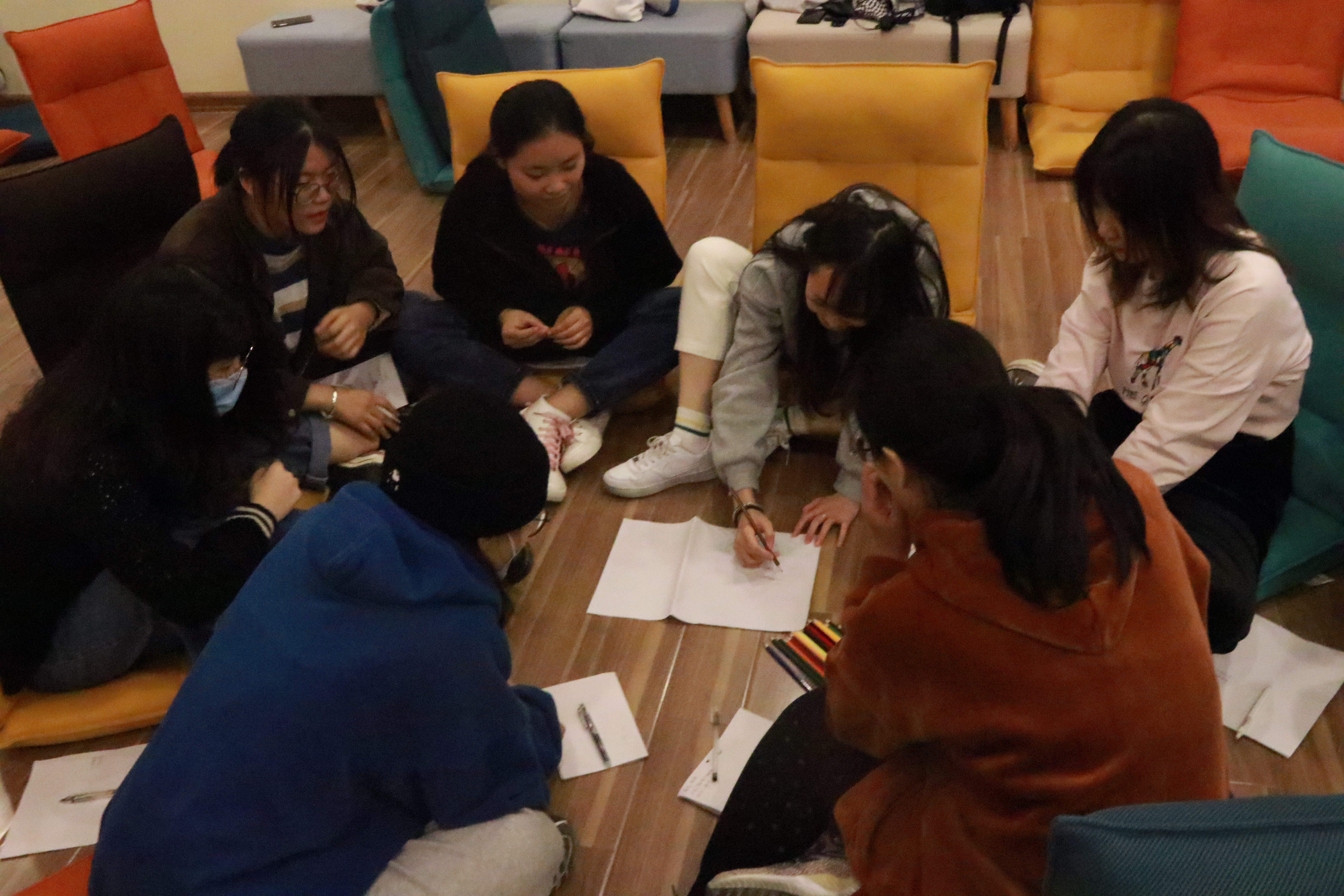 活动伊始,伴随着舒适轻柔的音乐,同学们在主持人李荣煌的带领下随意舞动,与迎面而来的有缘人微笑、碰拳,互打招呼。随着主持人不断喊出的数字,大家激烈抱团组队,“心心相印”环节让大家找到了自己的组织,还通过“真实自我四宫格”小活动介绍了自己并在主持人的引导下,为自己的小组取名字、给团队设计标志性口号和独特动作。刚刚组建的团队迎来了第一个考验,“心有守诚结”环节要求大家还原原有的小组围圈,同学们面对杂乱错综的链接沉着冷静、绞尽脑汁,用尽各种方法最终都回到了最初的团体,在这个过程中大家进一步接触团队成员,加深了对“集体”概念的认识。之后在“以画形心”环节,各小组围绕“未来的生活”进行为时五分钟的激烈探讨并用一分钟绘画完成了对个体和团体的期待,在主持人的引导下进行了团队契约宣誓,彼此承诺为对方保守秘密。活动最后,各组成员代表在团队鼓励下均快速、准确地念出了“左右脑之争”stroop文字为小组,团辅活动达到高潮,大家也纷纷感受到了团队的归属感和责任感。