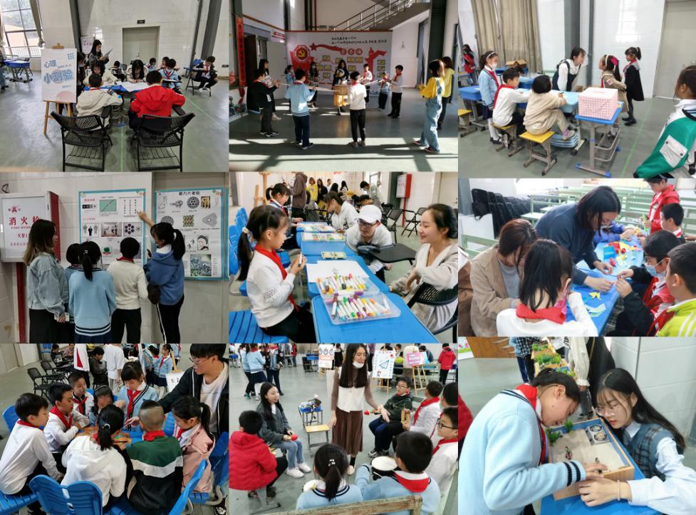 简短但隆重的签约仪式结束后,心理游园活动便紧锣密鼓地在城门中心小学礼堂拉开了帷幕,此次心理游园活动共分为四个板块,十个区域,每个区域都迎来了许多同学的积极参与。首先是版块一“心知学心事”,其中“抗疫心知识”里有关新型冠状病毒的相关漫画和面对疫情如何做自我心理防护相关知识,“心理趣味图”中普及了一些心理现象,心理咨询专业师生通过讲解和示范的方式为小学生普及心理知识及相关技能。在版块二“心语话心声”中,小朋友们参与了“心理小测验”、“房树人绘画”和“只言片语”,从不同角度对自己有了更进一步的了解。模块三“心动助心协”借助“鼓动人心”团体素拓和“音乐交响曲”鼓圈体验帮助小朋友们释放压力,体验团队合作的乐趣。在版块四“心选展心相”中,小朋友分别通过“九宫格箱庭”、“时光慢递”“创意折纸”表达了对学业的期待和对亲情、友情的感恩。