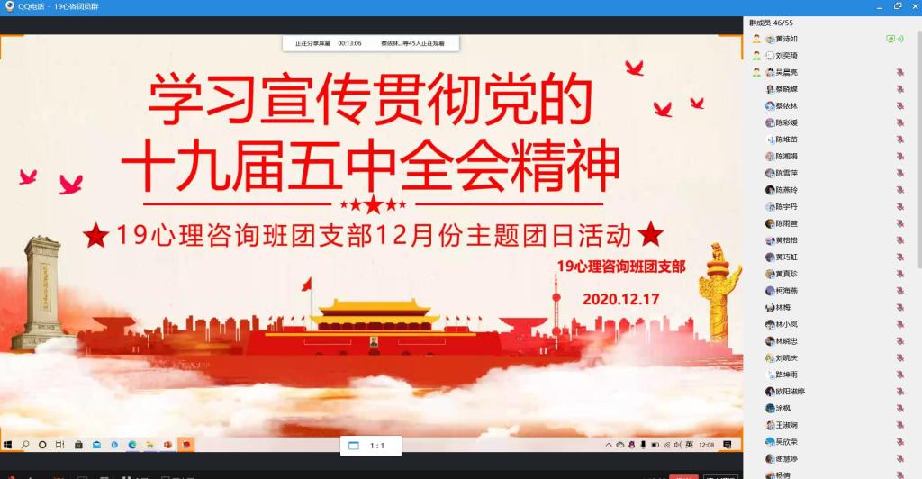 12月17日,19心理咨询班团支部于线上支部QQ群内举办以“学习贯彻十九届五中全会精神”为主题的团日活动。本次活动由团支书黄诗如同学主持,组织委员吴晨亮同学及团宣刘奕琦同学辅助配合,19心理咨询班团支部全体成员共同参与。