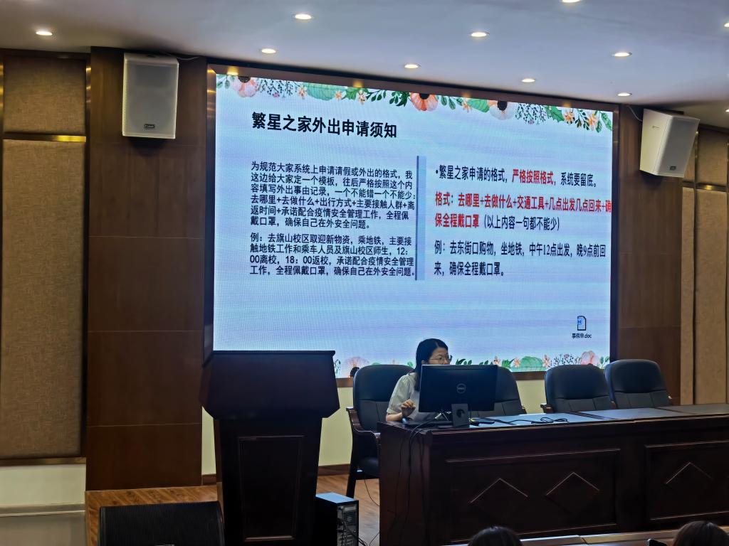 主题教育的起初主题教育的起初由人文社科系19级辅导员黄益群讲述返校后外出申请规范,严格按照学校防控要求实施管理,了解学生外出轨迹与动态,并要求全程佩戴好口罩,同时按照食堂规范用餐管理条例要求进行说明与讲解。其次是对于毕业生“三支一扶”、“西部志愿计划”的政策的说明,呼吁有意愿的同学积极参与,共同建设与发展国家基层建设,发扬青年志愿军的精神!