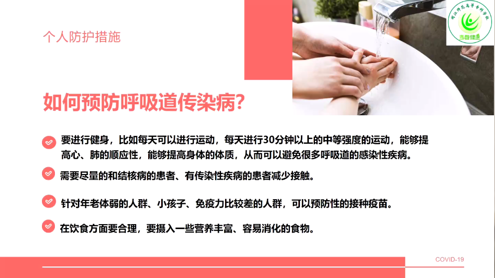 主持人严佳欣从了解新冠病毒易感染人群及传播途径,对密切接触者的注意事项,以及如何自我防护新冠病毒感染这四个方面为大家讲解。首先简单介绍了新型冠状病毒的的主要症状与德尔塔毒株。接着向大家说明了病毒的传播途径更多是通过飞沫传播,在疫情当下戴口罩的重要性。同时向同学们宣传疫苗接种的重要性,提高同学们的防范意识。最后,主持人向同学们科普了如何预防呼吸道传染病的知识。