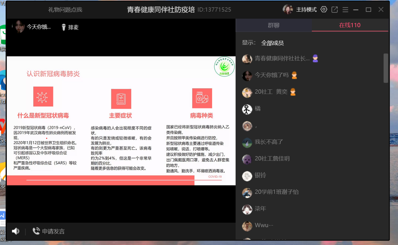 新冠疫情再次来袭,新冠肺炎仍处于进行时,防疫工作一刻也不能放松,也不再只是国家、政府所面临的问题。9月17日晚8时,青春健康基地同伴社在线上QQ会议举行“线上防疫培训”培训活动。本次活动由实践部严佳欣主持会议,社团成员进行会议现场秩序管理及辅助,参与对象为闽江师专全体同学。