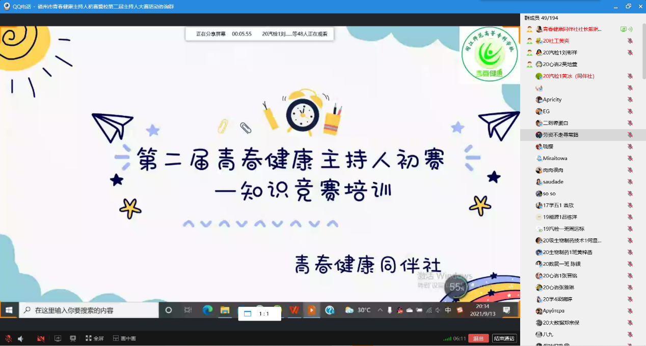 9月9日晚8点30分,青春健康同伴社在线上QQ会议举行“第二届青春健康主持人大赛”培训活动。本次活动由社长熊涓主持会议,社团成员进行会议现场秩序管理及辅助,参与对象为闽江师专全体同学。这次活动的主要目的是培训主持人大赛的参赛选手,对参选主持人大赛的同学进行规范化培训让同学们能正确的进行比赛。