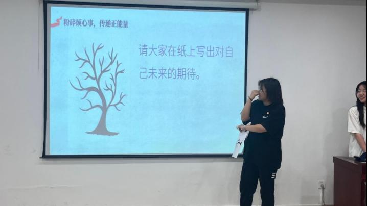 团支书以就业形势发问,引发支部成员深入解读当前就业形势与新时代的机遇和挑战,激发同学们的思考与探索。接着,通过团支书根据收集到的资料对当前就业形势和需求进行讲解,有利于同学们认清现实,树立正确的就业观念。同时通过“粉碎烦心事,传递正能量”小游戏让支部成员将自己的烦恼与消极情绪写在气球上,通过踩爆气球的方式来抒发压力,将自己的梦想与目标在纸上拼贴出来,互相交流与分享,进一步明确自己的未来方向。如此丰富多样的活动形式,支部成员表示不仅放松身心,而且能在轻松愉快的氛围中深入思考就业与未来,坚定信心,积极迎接挑战。