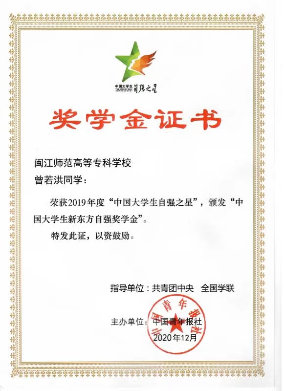 经过激烈的角逐,我系18文秘班学生曾若洪荣获2019年度“中国大学生自强之星”、“福建省大学生自强之星”,并获得“中国大学生新东方自强奖学金”。这是大赢家体育app下载同学第一次获得该荣誉。