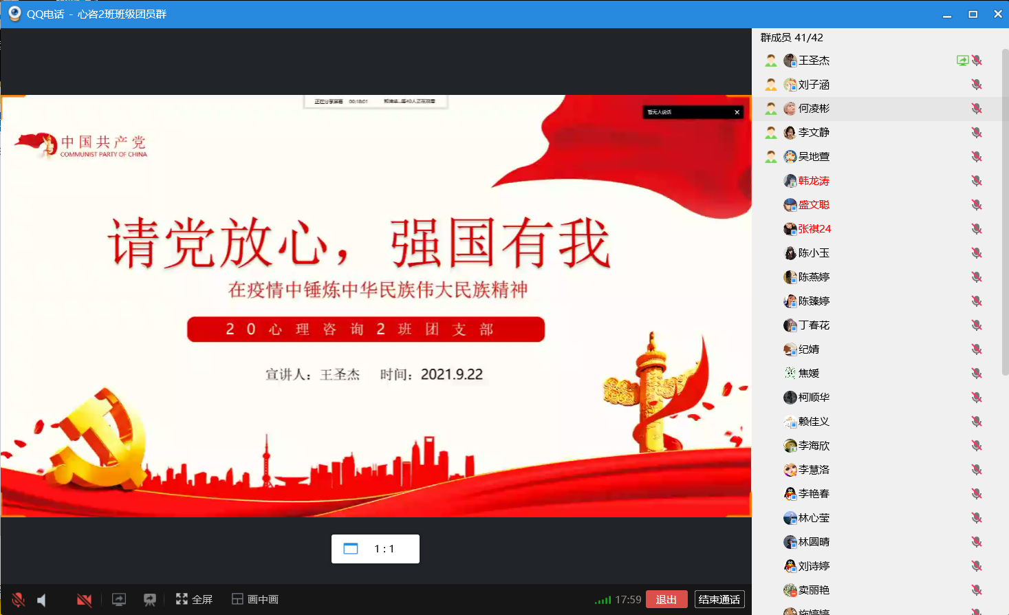 当前,毫不放松抓紧抓实抓细防控工作,统筹做好经济社会发展工作,既是一次大战,也是一次大考。20心理咨询2班于9月22日19时在线上开展 “请党放心,强国有我”主题团日活动。本次活动由班长王圣杰同学主持。
