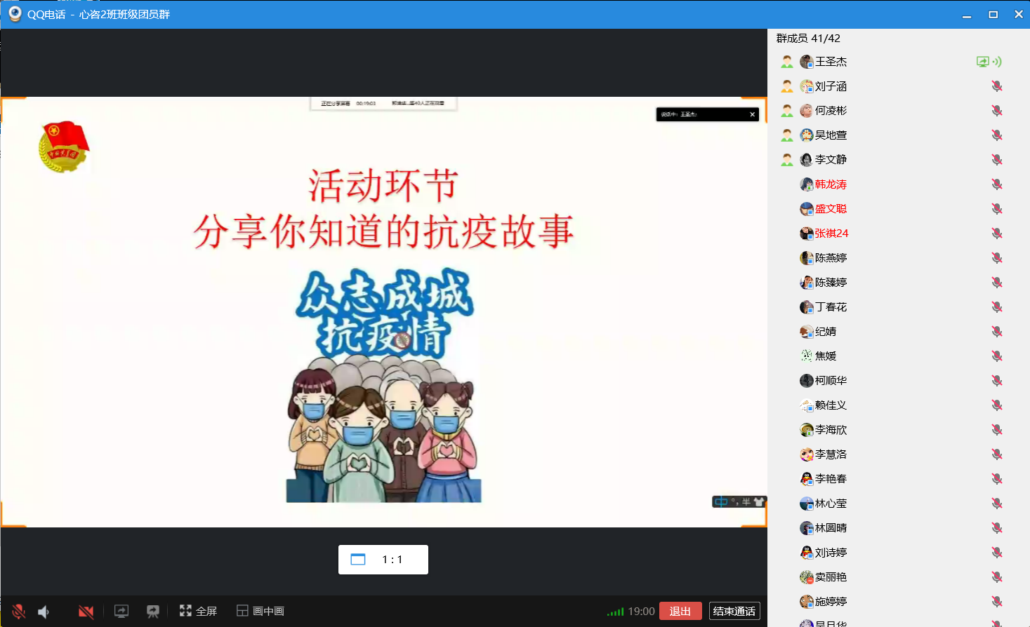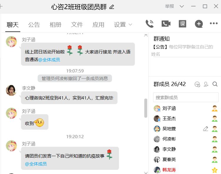 本次团日活动中,同学们从创新创造、奋斗战斗、团结合作、追逐梦想的伟大民族精神展开学习和探讨,在班长的带领下,一起学习了在此次抗击疫情的过程,中国青年志愿者的诸多先进事迹。此外,班级同学在线上积极开展讨论,分别讲述自己所了解的抗议故事、交流感想、表达感受。最后,此次充满豪情的“请党放心,强国有我”团日活动在同学们一声声坚定的团歌合唱中落下帷幕。