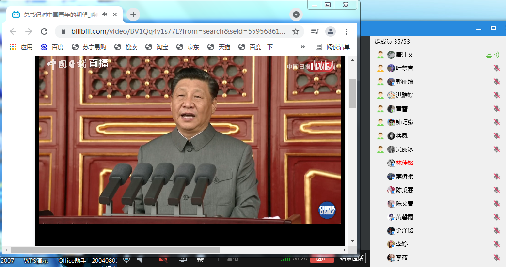 活动前期由团支书唐江文针对本次团日活动的开展同班委进行了讨论。本次线上活动流程首先由组织委员洪雅婷在班群发起群接龙签到,接着由文娱委员郭丽坤线上分享团歌,紧接着团支书组织大家线上观看“习近平总书记“七一”重要精神讲话”宣传片,同学们踊跃在班群发言,并且认真分享自己的感想,然后开展了线上诗歌朗诵和组织同学们开展了游戏环节,最后由组织委员洪雅婷再次发起群接龙签退。