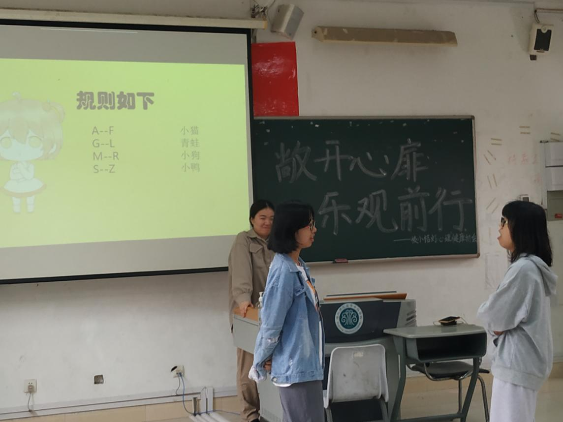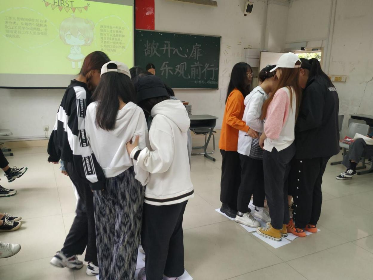 同学们在心理疏导后参加游戏。在游戏一中12名同学分成两组,每组之间都相互配合,也相互出谋划策,在游戏中同学们合作完成游戏,参与比赛的同学秉着必胜的决心,她们互相紧紧贴在一起,积极参与,在场内充满了欢声笑语;在游戏二中同学们根据姓氏首个拼音字母进行模仿动物叫声,他们跳出自己的舒适圈,挑战自我和他人的眼光,在游戏开始各种动物叫声此起彼伏,引得旁观的同学大笑,暂时忘记生活中忧愁,共同享受乐观氛围。