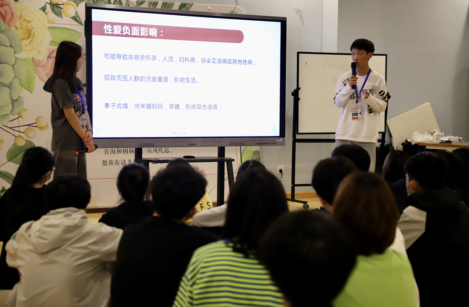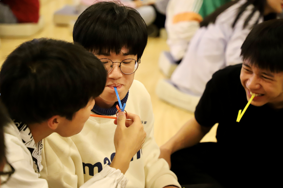 本次巡展强调“体验-讨论-辨析-成长”的活动模式,以“性行为与决定”团辅活动为例,同伴社实践部闫晓菲和郑浩担任主持,活动开场分组后,引导学员进行“吸管运输”的暖场小游戏,通过与同学们共同讨论对“性”的认识,展开对“性”的联想,并和同学们分享在大学生阶段 “性”是重要话题,要学会坦然面对。