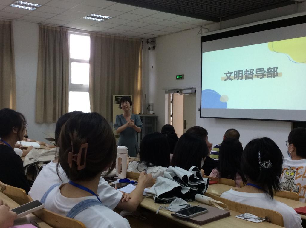在郭静静处长为往届干部颁发聘书,并公布新一届任职名单后,各部门负责人进行了简短的工作汇报。最后,郭静静处长对校自律委员会上一年的工作进行了总结,在肯定了校自律委员会所取得成功的同时,也总结了各部门这一年工作中的不足,对今后的工作发展提出宝贵意见,建议各部门积极沟通,彼此学习。郭静静处长强调,希望同学们在今后的学习和工作中,展示出良好的精神面貌,积极传播正能量,发挥创新精神,不负期待,尽职奉献,做好每一份工作,为全校师生服务。